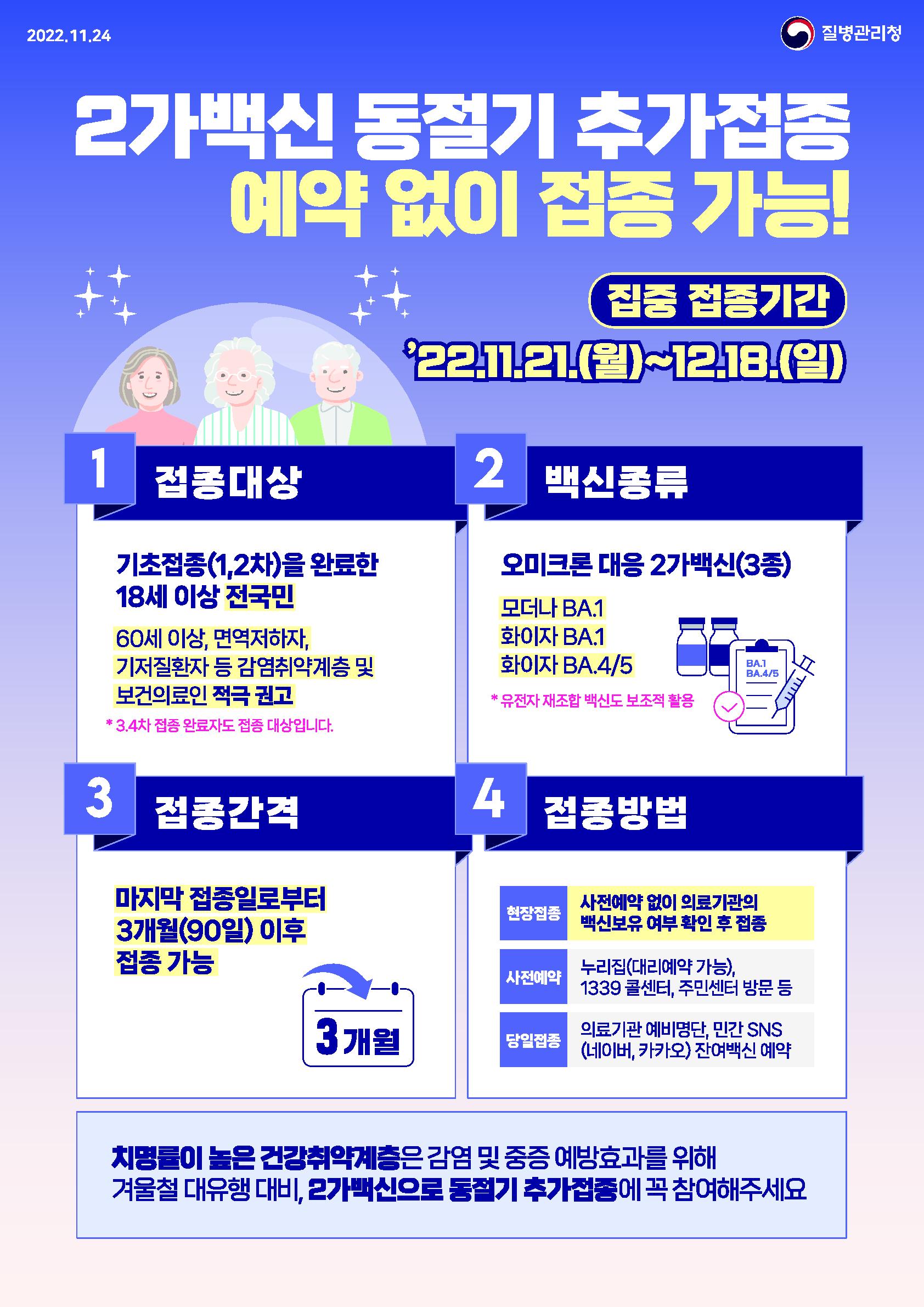 건강한 겨울나기를 위해 동절기 코로나19 추가접종에 참여해 주시기 바랍니다. 건강취약계층의 충분한 접종을 위해 [동절기 추가접종 집중 접종기간]을 연장합니다. ► 집중접종기간: 2022. 11. 21.(목) ~ 12. 31.(토) ► 접종대상: 기초접종(2차접종)을 완료한 12세 이상 전 국민 ※ 권고대상: 60세 이상 연령층, 면역저하자, 기저질환자, 감염취약시설 입원•입소•종사자 ► 접종백신: 모더나(BA.1), 화이자(BA.1), 화이자(BA.4/5) ► 접종간격: 마지막 접종일로부터부터 3개월(90일) 이후 ► 접종방법: 예약 없이 의료기관 문의 후 당일접종, 예약접종도 가능