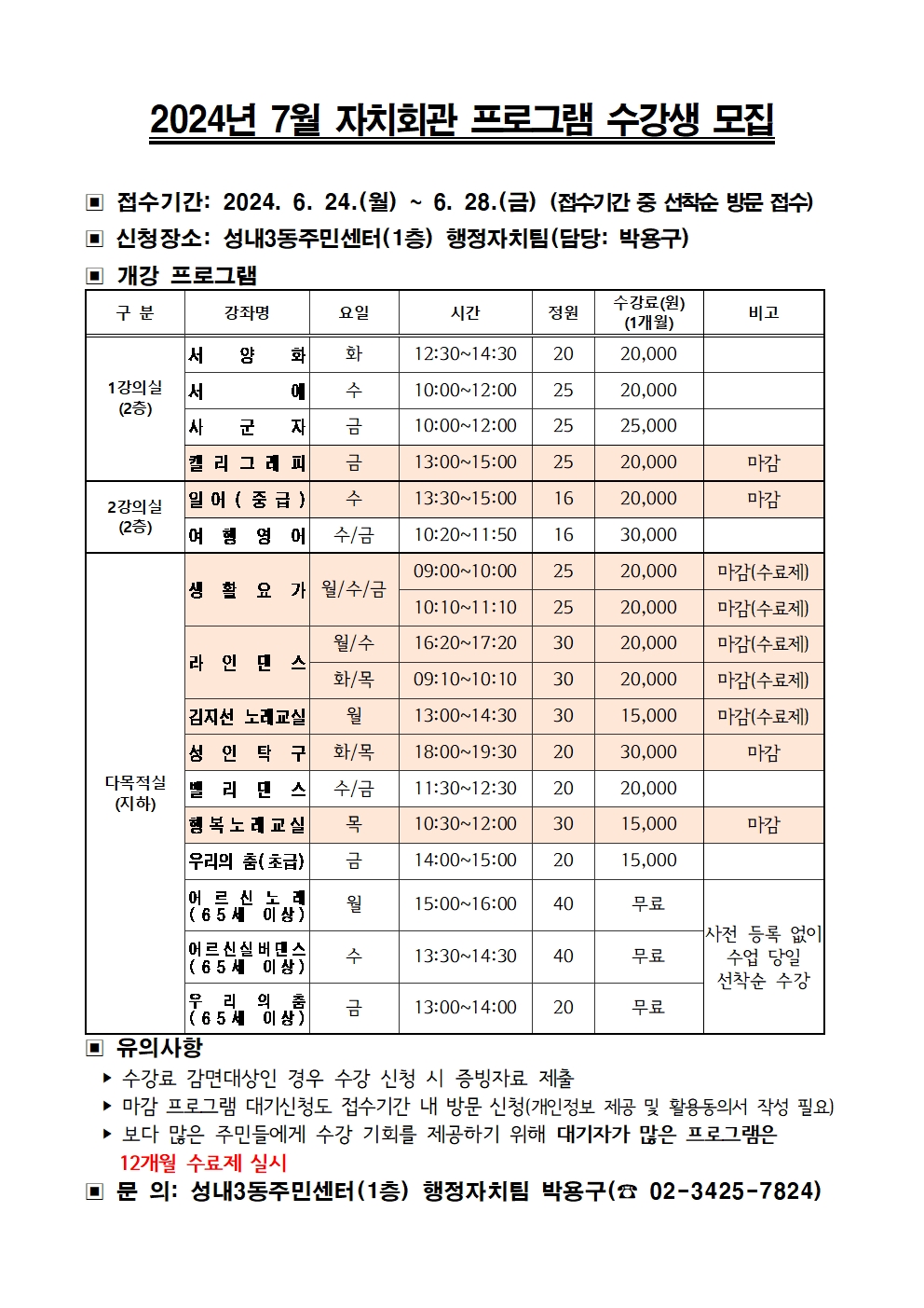 2024년 7월 성내3동 자치회관 프로그램 수강생 모집 안내