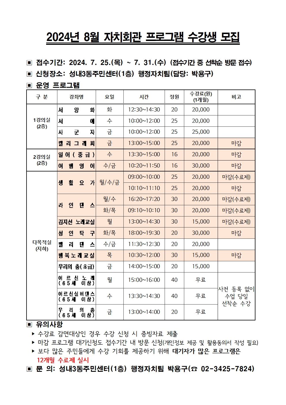 2024년 8월 성내3동 자치회관 프로그램 수강생 모집 안내