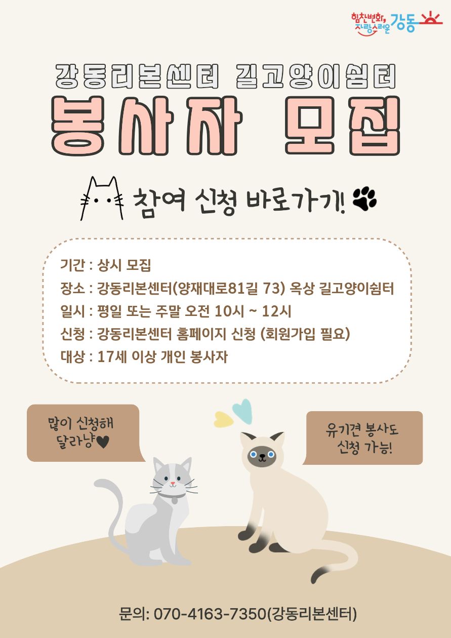 제목 | 강동리본센터 길고양이쉼터 봉사자 상시 모집 안내 | ||