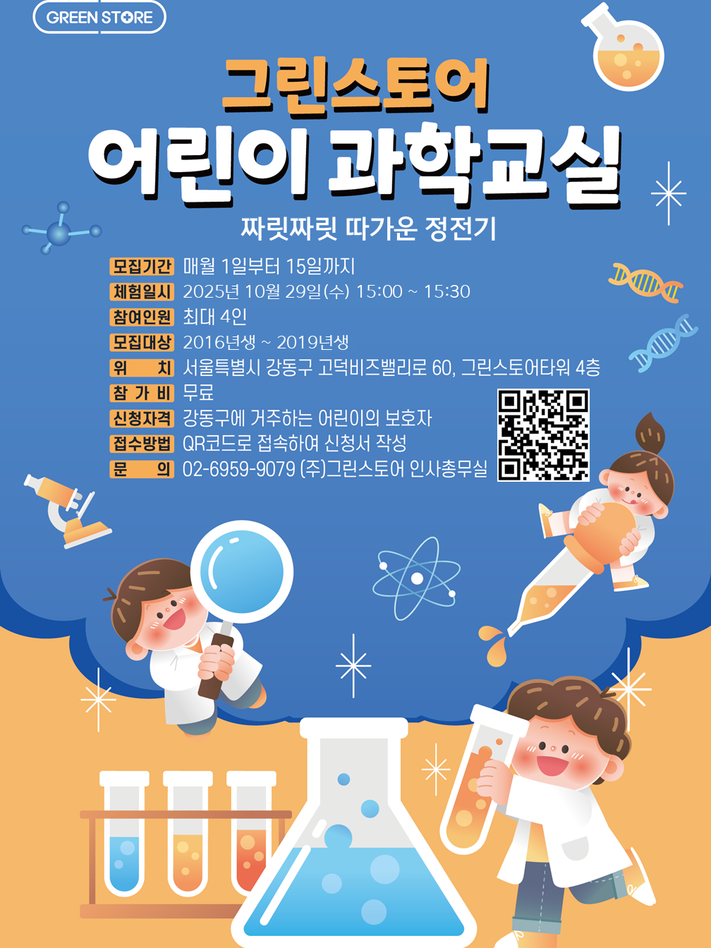 고덕비즈밸리 입주기업 ㈜그린스토어에서 주관하여 진행하는 “어린이 과학교실”의 10월 신청자를 모집하오니 주민 여러분의 많은 관심과 참여 부탁드립니다. <10월 체험: 짜릿짜릿 따가운 정전기> ○ 모집기간: 매월 1일부터 15일까지 ○ 체험일시: 매월 마지막 주 수요일, 15:00 ~ 15:30 ○ 위 치: 강동구 고덕비즈밸리로60, 그린스토어타워 4층 ○ 모집대상: 2016년생 ~ 2019년생 ※ 최대 4인 모집 ○ 신청자격: 강동구에 거주하는 어린이의 보호자 ○ 신청방법: 포스터 내 QR코드 접속하여 신청서 작성 ○ 참가비용: 무료 ○ 문의번호: 02-6959-9079 (주)그린스토어 인사총무실 자세한 사항은 포스터 참고 바랍니다! |