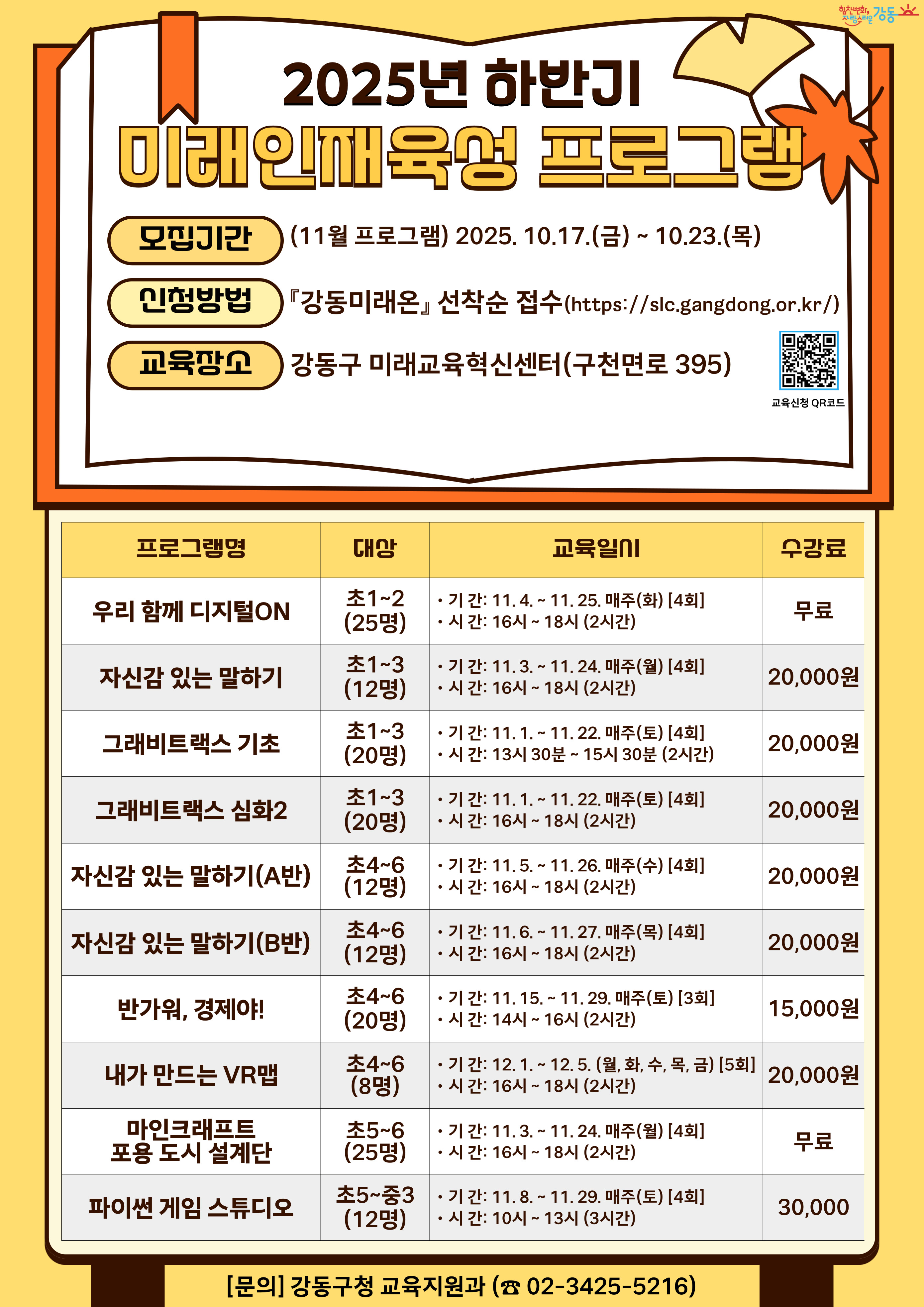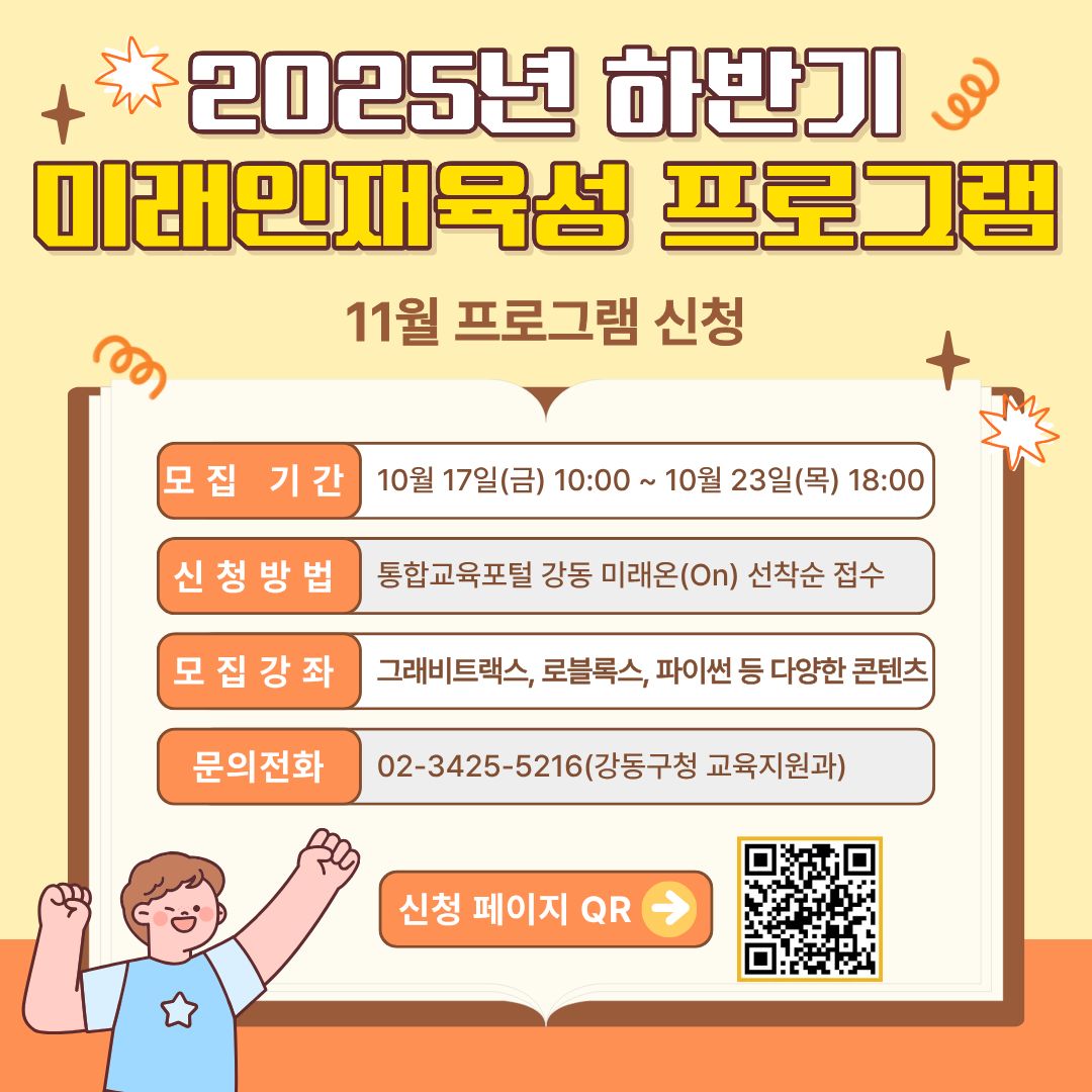 ▶ 신청 바로가기: https://slc.gangdong.or.kr/?m1=page&menu_id=208 강동구 초·중학생을 위한 특별한 미래교육 프로그램💝 그래비트랙스부터 로블록스, 마인크래프트, 파이썬까지! 창의력과 문제해결력을 키우는 체험 중심 수업으로 미래 기술을 쉽고 재미있게 배워봐요 😊 ■ 프로그램명 → (초 1~2) 우리 함께 디지털ON -나를 담는 디지털 놀이터- → (초 1~3) 놀이처럼 배우는 자신감 있는 말하기 → (초 1~3) 그래비트랙스(기초, 심화 2) → (초 4~6) 스토리와 구조로 배우는 자신감 있는 말하기 → (초 4~6) 반가워, 경제야! 용돈으로 시작하는 똑똑한 소비생활 → (초 4~6) 내가 만드는 VR맵! 로블록스 제작 교실 → (초 5~6) 마인크래프트 포용 도시 설계단 -디지털 건축 수업- → (초5~중3) 파이썬 게임 스튜디오! 코드로 완성하는 나만의 게임 ■ 운영 일정: 프로그램별 운영 일자 상이 ■ 모집 기간 → 2025. 10. 17.(금) 10:00 ~ 10. 23.(목) 18:00 → 선착순 접수! ■ 신청 방법 → 통합교육포털 강동 미래온(On) 접속 → 신청 바로가기: https://slc.gangdong.or.kr/?m1=page&menu_id=208 → 로그인 후 신청 / 수강료 입금 필수 (※ 감면/면제 대상자는 입금 전 반드시 확인 바랍니다) ■ 문의 → 강동구청 교육지원과 ☎ 02-3425-5216 → 2025년 하반기 미래인재육성 프로그램 한눈에 보기: https://slc.gangdong.or.kr/?m1=gallery_detail&menu_id=173&board_id=6765&board_content_id=11858 |