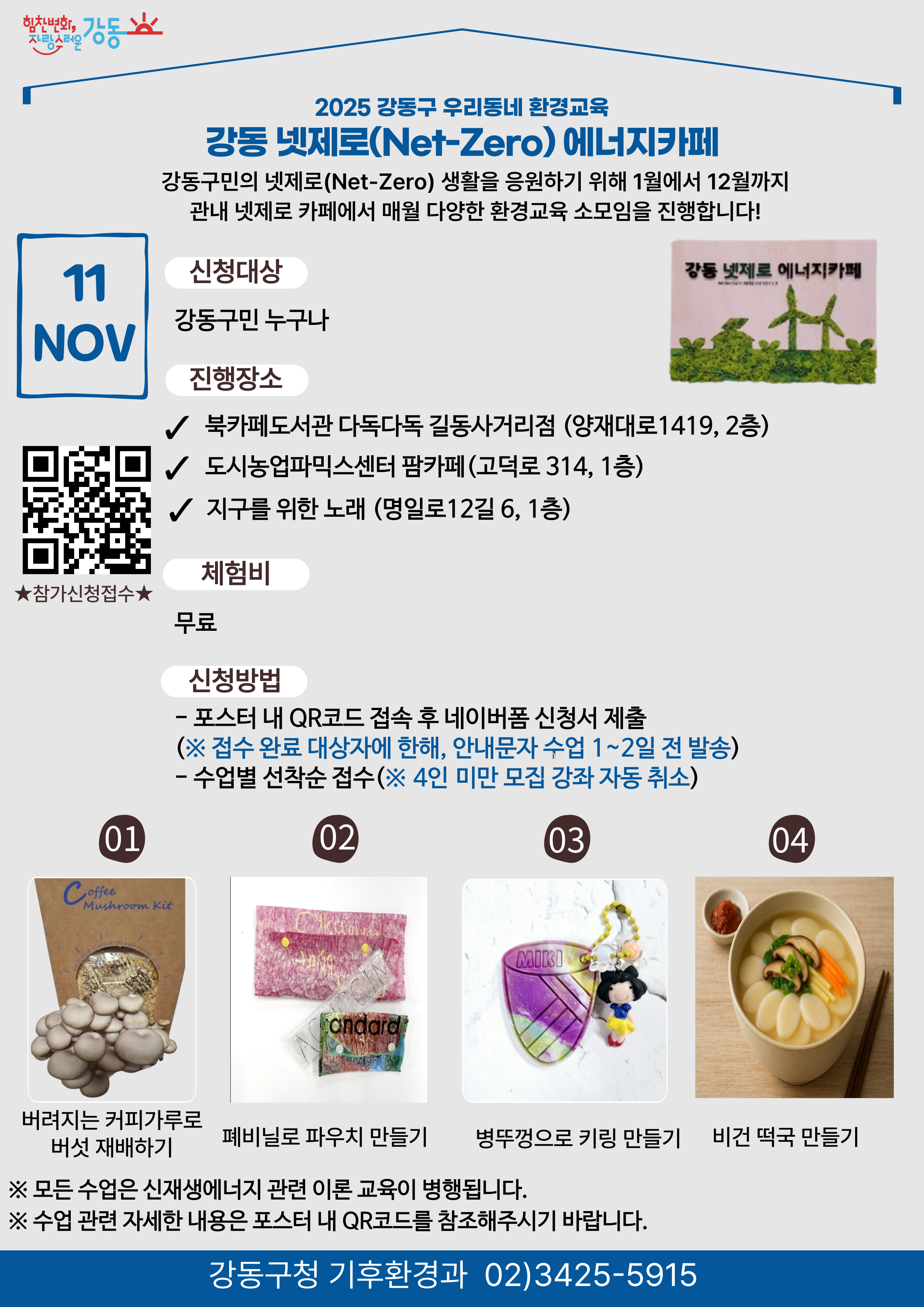 3. 체험비: 무료 4. 신청방법 : 포스터 내 QR코드 또는 https://naver.me/GLzNBI5l 접속 후 신청서 제출 (※ 노쇼 시, 차후 환경교육 프로그램 신청 제한) 5. 문의: 강동구청 기후환경과(02)3425-5915) |